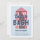 Convites de aniversário de verão bonitos para a celebração do seu beachside apresentam uma ilustração de cabana de praia listrada vermelha e branca com "bash de praia" em marinho azul e branco em letras retrorreflectoras. Personalize com seus detalhes de festa de aniversário abaixo.