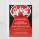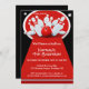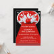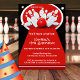 Um convite de aniversário com uma cena de boliche em uma configuração de cores mínima esportiva vermelha, preta e branca.