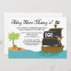 Esta festa de aniversário dos meninos 5x7 convida tem um tema do pirata. Há uma ilha na esquerda com uma arca do tesouro e um caranguejo. À direita, há um grande navio de pirata com um menino que guardara uma espada nela. Há dois crânios alegres de Roger no navio. Você pode facilmente personalizar sua informação do partido no centro. design dos direitos reservados 2010 JD Digi