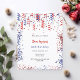 Um fundo branco chic. Decorado com confete patriótico e correias partidárias em vermelho, azul e branco. Personalize e adicione um nome e detalhes da parte. O nome é escrito com um script de estilo manuscrito. 1 folha = 1 convite impresso de borda a borda.