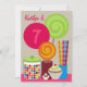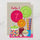 Um convite de aniversário que caracteriza uma ilustração de três pirulitos, de um frasco dos gumballs, de um recipiente de doces da vara, de uma parte de chocolate, e de um cupcake. Personalize o texto na parte dianteira e na parte traseira.