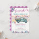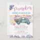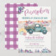 Convite de Aniversário Caminhão Antigo Roxo e Azul Claro com Menina Fazendeira Aquarela, Floral de Outono e Abóboras.