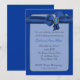 Elegante convite de aniversário de casamento feito em azul. Uma área de texto semitransparente em camadas é delimitada por uma borda em tom dourado, com gráficos de uma linda fita de cetim azul no topo, com uma jóia de safira azul emoldurada a ouro. Personalize todo o texto para atender às necessidades da sua festa. Um convite de aparência muito elegante e formal.