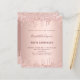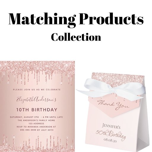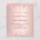 Um convite moderno, elegante e glamoroso para a festa de 50 anos (ou qualquer idade) de uma mulher. Um fundo metálico rosa dourado falso com um efeito de gotejamento de brilho rosa dourado elegante, imitando tinta pingando. O nome é escrito com um estilo de letra manuscrita moderna em cor rosa dourado escuro. Personalize e adicione um nome, idade e os detalhes da sua festa.