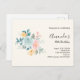 Convite de aniversário com uma bela ilustração em aquarela. Um buquê de flores com flores rosa e azuis cercadas por folhas verdes e raminhos.