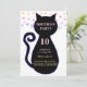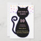 Silhueta de gato fofo e confetes multicoloridos em um fundo branco e rosa, convite de aniversário. Todos os textos e números estão prontos para serem personalizados.