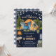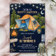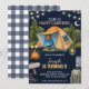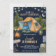 Convite de aniversário com tema de acampamento. Uma tenda fica sob luzes de cordão com uma lua crescente e pinheiros. O texto diz "Chamando todos os campistas felizes! José está fazendo 8 anos." Uma fogueira e uma lanterna adicionam calor.