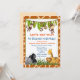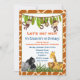 Um convite de aniversário com um tema de safari legal. O fundo é um padrão de pele de girafa. Projetado com um banner de folhas da selva no topo e macacos travessos pendurados de cabeça para baixo. Um hipopótamo, gorila, leão e girafa se divertindo na parte inferior em algumas gramas da savana. Personalize com os detalhes da sua festa.