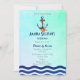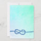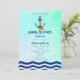 Um convite de aniversário temático náutico. Especificamente para festas que serão realizadas à beira-mar. O fundo é uma textura suave em verde etéreo em aquarela. No topo deste convite há uma âncora pintada em aquarela em rosa avermelhado com uma corda aqua verde enrolada e uma concha na base. A borda inferior do cartão tem um padrão de água ondulada azul, de acordo com o tema marítimo. No verso, há uma corda náutica azul com nós. Personalize com os detalhes da sua festa.