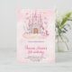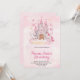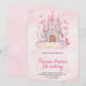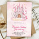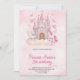 Convite de aniversário com um castelo rosa, rodeado por pássaros e um unicórnio, colocado num fundo rosa suave. O texto convida para "O 8º aniversário da Princesa Arletta".