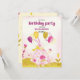 Um convite de aniversário com um coelho. Um coelho fofo num vestido cor-de-rosa fluffy com flores e balões. Um convite de aniversário para uma garota de tons cor-de-rosa e amarelo. Ilustração com textura granulada e textura de lápis.