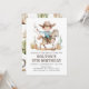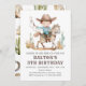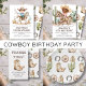 Personalize seu próprio convite de aniversário temático de cowboy com este charmoso design. O convite apresenta uma ilustração pormenorizada de um jovem cowboy a cavalo, colocado sobre um fundo branco.