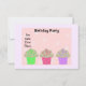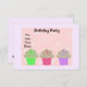 Um divertido convite de aniversário com três cupcakes de cor brilhante em verde, rosa e roxo com cupcakes de bolinhas. Uma borda de fundo de bolinhas rosa suave por mauve leve. Personalize com as informações de sua parte conforme desejado.