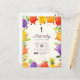 Este design faz parte da coleção de festa de aniversário infantil 'Fruta Dançante'. Ele apresenta papelaria fofa com frutas tropicais em aquarela, como mamão, uvas, morangos, laranjas e abacaxis, juntamente com folhas e notas musicais. Perfeito para celebrações de aniversário de meninos ou meninas.