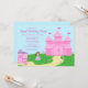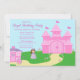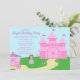 Este convite para festas de aniversario de meninas 5x7 tem um tema de princesa real. Há um castelo rosa quente no fundo com uma estrada revestida de flores rosa e azuis na frente. À esquerda, há uma princesa parda de cabelos perto de uma carruagem que está dirigindo pela estrada. Na parte superior esquerda, você pode personalizar facilmente as informações do participante. © 2012 Jessica Weible/JW Ilustrações