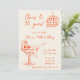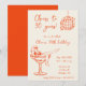 Convite de aniversário desenhado e manuscrito com uma bola de disco e uma mulher sentada em um coquetel.