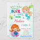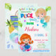 Convite de aniversário de piscina A garota convida para a piscina de convite para aniversário de sereia convidando para Piscina. Venha fazer um salto com este belo convite para o aniversário divertido de água da menina apresentando duas sereias bonitas. Basta editar este modelo fácil de usar no menu Personalização para torná-lo especial.