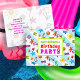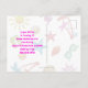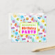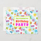 Convite postal de festa de aniversário de Verão. Esta design de Verão tropical é perfeita para uma festa de filha adolescente, ou para o fim da festa de piscina escolar. O texto de cor clara corresponde ao divertido design de verão, que inclui imagens de óculos de sol, chinelos, estrelas-do-mar, palmeiras, conchas e mais impressas sobre listras claras, azuis e brancas. A frente tem três linhas para personalizar e dizer, "Você é convidado para uma festa de aniversário" com outra modelo de texto atrás para informações da festa. Todo texto é fácil de ser alterado para qualquer tipo de parte.