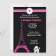 Convites de festas de aniversários Eiffel preto e rosa monogramados. A design apresenta a torre Eiffel e um poodle francês. Excelente para as festas do Paris Themed. Personalize com os detalhes do seu partido.