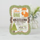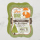 Raposa-de-laranja giro, fofa-laranja-engraçada e pinheira-pintada enfoque crianças, festa de aniversário convidada no padrão de folhas verdes de sábio. Um e primeiro aniversario podem ser personalizados para outros aniversários para bebês, crianças, ou bebês, bebê. Excelente convida para a festa de aniversário dos rapazes!