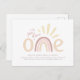 Este cartão postal de convite de aniversário de 1 ano boho arco-íris e sol é perfeito para uma festa de aniversário de primavera ou verão. O simples arco-íris monocromático e os raios de sol são delicados e doces para o seu pequeno. Basta personalizar com as informações da sua festa para um convite de aniversário adorável e estival!
