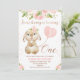 Convite de Aniversário de 1 Ano Coelho Rosa Floral Dourado Convite de aniversário de um ano fofo para coelhinho com cabeçalho em caligrafia dourada rosa. O design também apresenta uma composição floral rosa e balão em forma de coração rosa. Este é um design doce para o primeiro aniversário da sua filha.