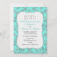 Convite de aniversário de casamento de 25 anos elegante feito em um tom ciano aqua e padrão de damasco prateado. Gráficos de uma área de texto branca emoldurada com brilho prateado têm texto gráfico em tom prateado, no topo, lendo 25º. Personalize o restante do texto para a celebração do seu aniversário.