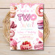 Celebre o doce marco do seu pequeno com este adorável convite de aniversário "DOIS Doces"! Perfeito para a festa de 2 anos de uma menina, este convite editável apresenta um tema divertido de sobremesas cor-de-rosa com donuts, cupcakes, sorvete, macarons e confeitos — todos em cores pastéis sonhadoras.