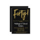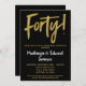 Um convite de festa de aniversário de casamento de 40 anos preto e dourado, elegante, simples mas impressionante. Texto com letra glamorosa no topo e texto dourado abaixo com o nome em branco destacado