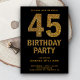 Surpreenda seus convidados com este convite de aniversário de 45 anos glamouroso, apresentando um texto brilhante em dourado negrito contra um fundo preto. Basta adicionar os detalhes do seu evento neste modelo fácil de usar para torná-lo um convite único. Vire o cartão para revelar uma textura de brilho dourado falso no verso do cartão.