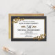 Convite de Aniversário de 50 Anos de Casamento em Moldura Dourada projetado com uma moldura preta, inserção dourada e detalhes de fita. O verso tem um fundo texturizado dourado. Para personalizar, basta inserir seus detalhes em nosso modelo fácil, substituindo o texto de exemplo. Certifique-se de ver o Banner de Festa correspondente.