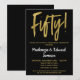 Um convite de aniversário de casamento de 50 anos preto e dourado, elegante, simples mas impressionante. Texto com letra glamorosa no topo e texto dourado abaixo com o nome em branco destacado