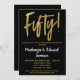 Um convite de festa de aniversário de casamento de 50 anos preto e dourado elegante, simples mas impressionante. Texto de roteiro glamoroso no topo e texto dourado abaixo com o nome em branco destacado