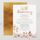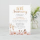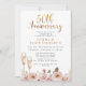 Convite de aniversário de casamento de 50 anos em estilo boho com flores em tons de blush, cabeçalho em caligrafia dourada falsa e duas taças de champanhe. A parte de trás do convite é uma imagem em folha dourada falsa.