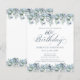 Flores em azul poeira criam bordas superior e inferior neste convite de aniversário elegante. A caligrafia clássica em letra cursiva adiciona um toque lindo. Este item faz parte da coleção floral em Azul Poeira.