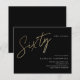 Convite de aniversário de 60 anos minimalista moderno apresenta número de folha dourada falsa estiloso em script manuscrito Sessenta e os detalhes da sua festa em fonte serif clássica em cor de fundo preto, simples e elegante, ótimo convite de aniversário surpresa para homens e mulheres adultos. a cor de fundo preta pode ser alterada para qualquer cor de sua escolha.