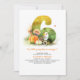 Convites de aniversário de abóbora pequena com abóboras laranja e branca, folhas de outono coloridas, girassóis, trigo e frutas