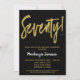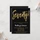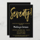 Um convite de aniversário elegante, simples, mas impressionante, preto e 70. Texto do script de visão na parte superior e texto dourado abaixo com o nome em branco sobressalente