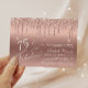 Elegante, chique e acessível convite de festa de aniversário de 75 anos com "75 & Fabuloso" em uma escrita branca estilosa contra um fundo dourado rosa com gotas de brilho falso dourado rosa.