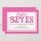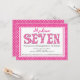 Comece sua sétima festa de aniversário com nosso adorável convite para a festa de aniversario de meninas do alfabeto do 7 rosa. Nosso convite de aniversário de meninas fofo apresenta a palavra "sete" em um padrão de bolinhas rosa e branco quente, definido em um fundo branco com um quadro de borda pontilhada polka rosa e branca.