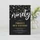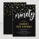 Convites de aniversário de 90 anos modernos com um fundo preto elegante, confetes brancos e dourados, o título 'noventa' em uma fonte de letra cursiva em negrito e um modelo de texto simples que é fácil de personalizar.