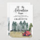 Que a aventura comece o temático convite de aniversário de coloração d'água acampando com florestas e montanhas paisagem selvagem e tipografia de script de caligrafia. Por um fim de semana de diversão!