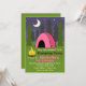 Um convite de festas de acampamento de aniversário com uma ilustração de uma tenda cor-de-rosa com árvores cada vez verdes no fundo. Estrelas e luas no céu, fogueira em frente à tenda. Personalize o texto com detalhes da sua ocasião.