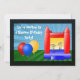 Celebre a sua festa de aniversário de castelo com estes convites de festas festivos e coloridos. Excelente para crianças, adolescentes fazem festa de casa. Design apresenta cores primárias e grama verde com céu azul, e quadro preto, ilustração da casa de salto em amarelo, azul e vermelho, e três balões. Personalize com seu texto na frente e atrás.