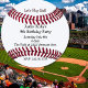 Convite de aniversário redondo divertido, com gráficos de costura vermelha de baseball, em um fundo branco. Personalize o texto preto e vermelho para a festa de aniversário desportiva do seu filho.