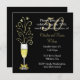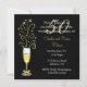 Convite de festa de aniversário de casamento de cinquenta anos chique, feito em preto e dourado. Gráficos de um copo de champanhe festivo decorado com um laço em tom dourado, no caule, e faíscas saindo do topo, decora o lado esquerdo do convite preto. O texto em branco e tom dourado é totalmente personalizável para atender às necessidades do seu evento.