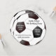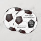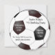 convite de aniversário redondo divertido, com gráficos das marcas preto e branco de uma bola de futebol. Personalize o texto preto e branco para a festa de aniversário do tema desportivo do seu filho.