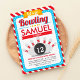 É uma festa de boliche. É hora de boliche! Tire a diversão e comemore seu aniversário de Boliche com nossa Convite de festas. Este convite de aniversário de boliches apresenta pinos de boliche e bola de boliche no padrão de faixas vermelhas do estilo retrô. Perfeito para as suas pequenas bolachas, boliche temática. Prepare-se para rolar e jogar boliche para sua festa de aniversário temática esportiva. Este modelo de convite para boliche é perfeito para a sua festa de boliche, convites para a noite de boliche, convites para o aniversário de boliches.