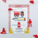 Um convite de aniversário com tema de bombeiros com ilustração de um caminhão de bombeiros, chamas, machado e hidrante de incêndio. O fundo na frente e atrás é tijolo. Personalize o texto com detalhes da sua ocasião. Postagem de coordenação, adesivos e mais estão disponíveis na Paperie de Jill.