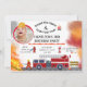 Incêndios aos seus convidados com esta festa de aniversário legal, convidando com um local de incêndio realista onde um bombeiro é incendiado com água. Um caminhão de bombeiros e equipamentos fofos de combate a incêndios também estão lá. Basta adicionar os detalhes do seu evento e a imagem do seu filho neste modelo fácil de usar para torná-lo um convite único. Sacudir a placa para revelar um fundo elegante de fogo vermelho e laranja na parte traseira da placa.